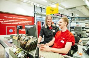Täällä on mieletön porukka! Jos itselle sattuu huono päivä, olo kyllä piristyy täällä töissä, tuumivat Myyrmäen K-Citymarketin asiakaspalvelu-päällikkö Mari Liikanen, joka opastaa Aleksi Sorjosta kassalla.